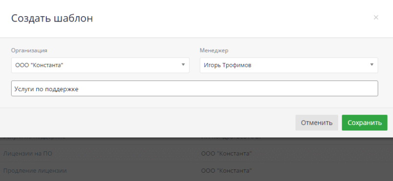 Самая популярная услуга в фирме «Константа» — поддержка сайта. Первый шаблон счета, который создаст Мария будет включать всевозможные позиции именно по этой услуге. Шаблон счета создается в разделе Финансы → Счета, через кнопку в правом верхнем углу «Создать счет». В открывшемся меню нужно выбрать пункт «Создать шаблон».