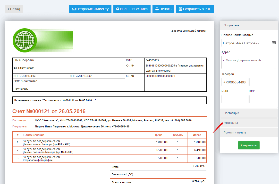 При необходимости, бухгалтер в режиме просмотра счета может быстро изменить, добавить реквизиты клиента или поставщика, логотип и печать. Изменения будут автоматически сохранены в карточке клиента, модуле CRM или в настройках организации.