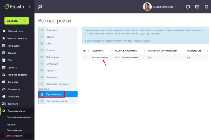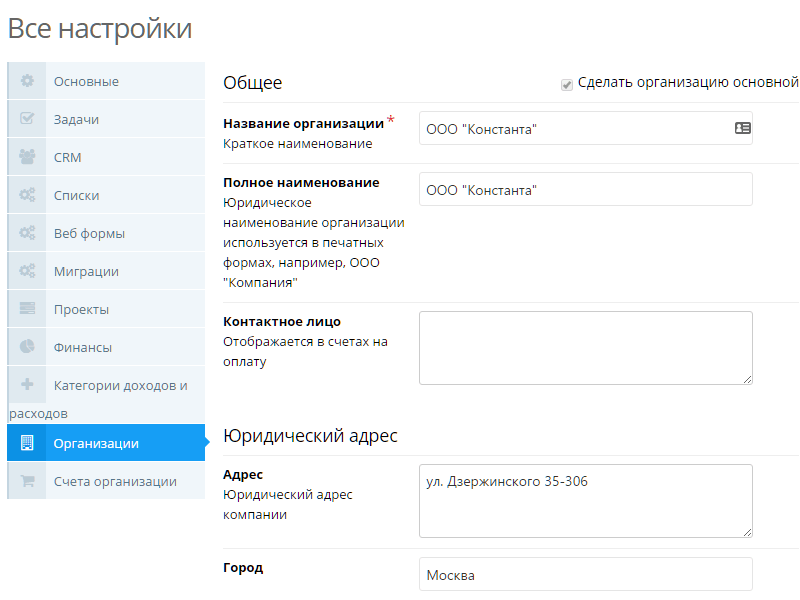 Для начала работы необходимо заполнить реквизиты организации, от которой будут выставляться счета. Настройки организации доступны только администратору портала. Для этого нужно перейти в «Личный кабинет» → «Все настройки»→ «Организации». По умолчанию там уже создана одна организация. Вам нужно просто зайти в нее и указать наименование, адрес, реквизиты.