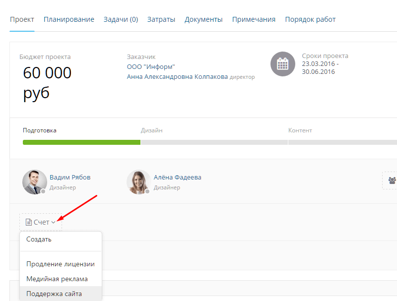 Теперь, благодаря шаблону, менеджеры смогут выставлять счет буквально в 2 клика из карточки клиента, проекта или сделки. Для этого нужно нажать всего лишь на кнопку «Счет» и в выпадающем списке выбрать необходимый шаблон.