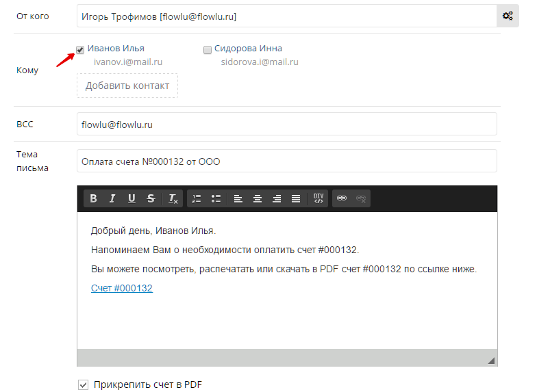 Менеджер отправляет счет клиенту из системы за 5 секунд. Для этого ему нужно нажать на кнопку «Отправить клиенту», отметить галочкой один или несколько контактов, которому собирается отправить. А если нет нужного контакта, то здесь же быстро создается новый. Система сама подставит имя клиента в шаблон письма и прикрепит файл счета.