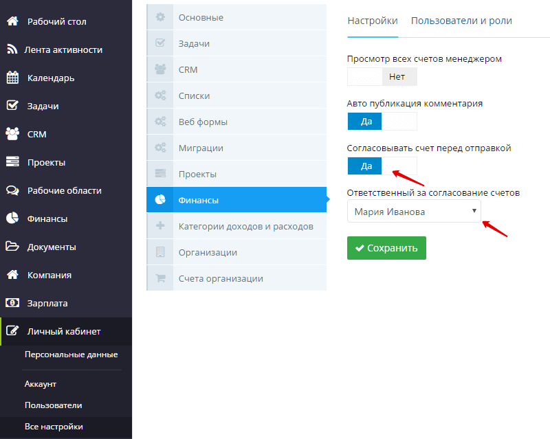 Чтобы сократить число ошибок, руководитель агентства устанавливает опцию согласования счета в настройках системы и назначает ответственным бухгалтера Марию Иванову.